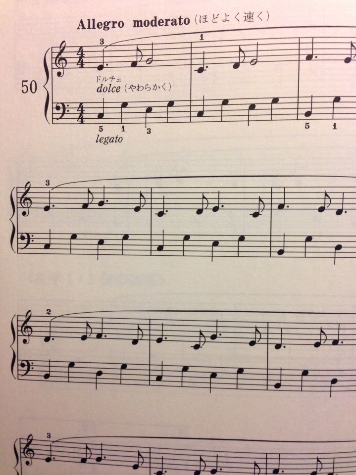 付点のリズムも出てきて、この50番あたりまでくるともうだいぶ音符もすぐ読めて両手のいろんな動きにも慣れてきます。