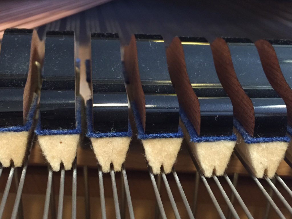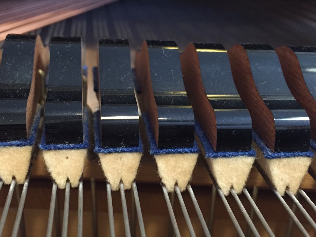 上の黒いのに白いフェルトが付いているのが「ダンパー」で、通常の状態では下がっていて弦の振動、つまり音を止めています。