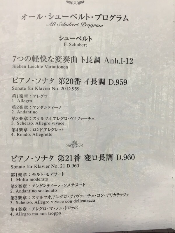 あとはですね、この演奏会を聴いて思ったのは、シューベルトってなんでこんなに長いんだろう・・・と単純に不思議に思っていたんですけど、あ、そうか、シューベルト自身が演奏が、自分の音楽が好きだったから続けたかったんだ、次々と湧いて来る美しいメロディーを、ハーモニーを、もっとずっと続けたかったから長いんだきっと。