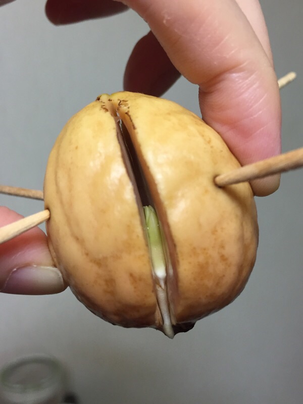 アボカドの種を水に浸けといたらパカっと割れて根っこがチョロっと出て来たよ♪
