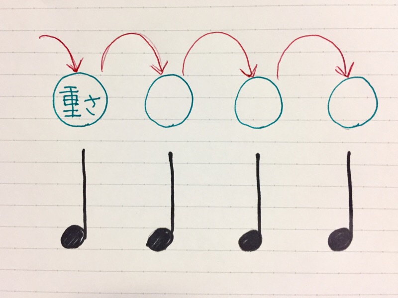 同じように、指にも重さを乗せたら手首をはずませずに、次の指、そのまた次の指に重さを「乗せかえて」弾きます。