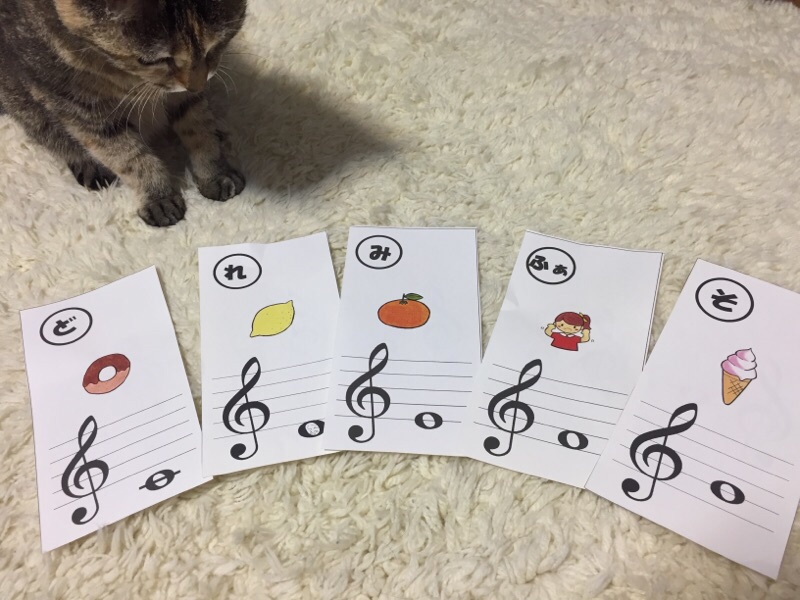 最初少しはずかしそうでしたが、私の話をちゃんと聞いてくれて、ピアノの鍵盤でじゃんけんあそびをしたりしながらさっそく「ド」の位置を覚えて、私の大好きな「どれみふぁそカード」を使いながら「どどどどどーなっつ」の歌を歌いました。