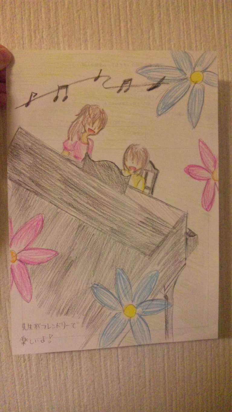 先生はピアノのこと以外の話でもちゃんとうなずいて聞いてくれるとても良い先生です。色々なことを話していると外見では分からない一面が分かったりして、とても楽しくておもしろくて、ピアノ教室に行くのがすごく楽しみで待ち遠しいです。不器用な私でもゆっくり分かるまで教えてくれて、おかげで成長しました。