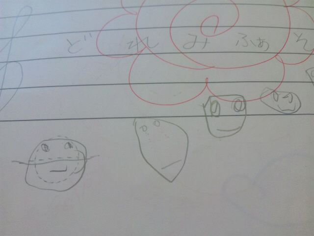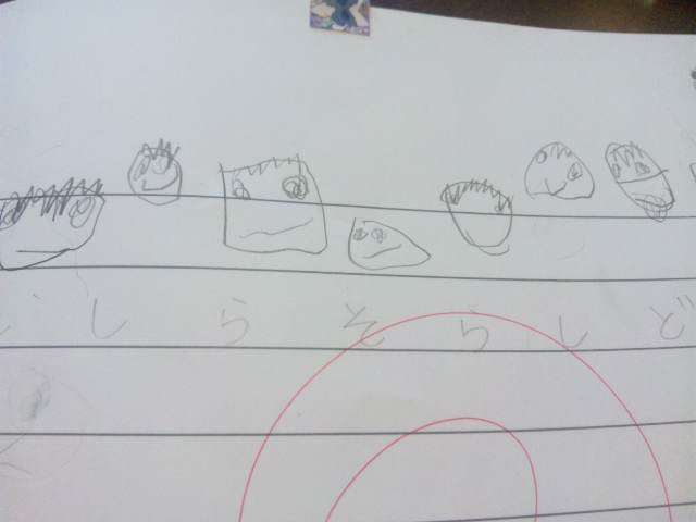 最初にドレミの音符を教える時に私が音符に顔を描くので、Yちゃんの書く音符にも顔があります☆