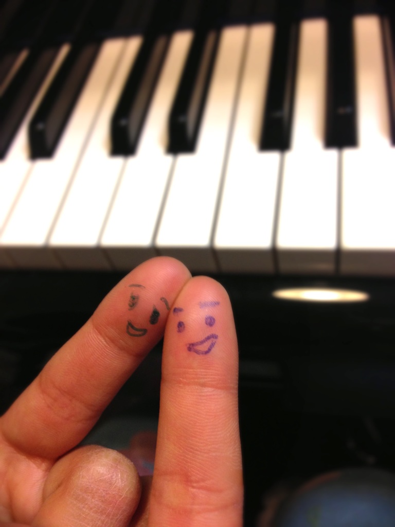 「このおでこのところで弾くんだよ!お顔が消えないように指を立てて弾こう。がんばれ〜♪」ということでこんなんなりました。(※よい子はマネしないでね!ママにおこられるよ!!)