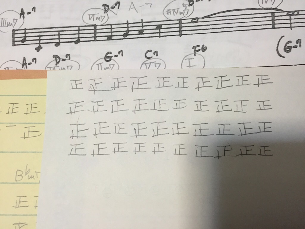 ↑これはですね、明日(もう今日)ジャズのレッスンなので、それまでに課題の「The Days of Wine and Roses(酒とバラの日々)」のアドリブ練習を200回やろう!と目標を決めて練習してた跡です。あ、一日で200回やったわけじゃないですよ。何日かでコツコツやって達成したところです。