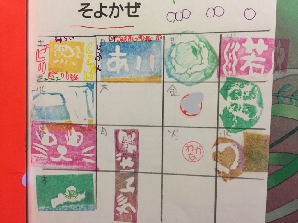 こちら小学生のAちゃんが自主的に付けてきてくれた「消しゴムはんこ練習したよマーク」。
