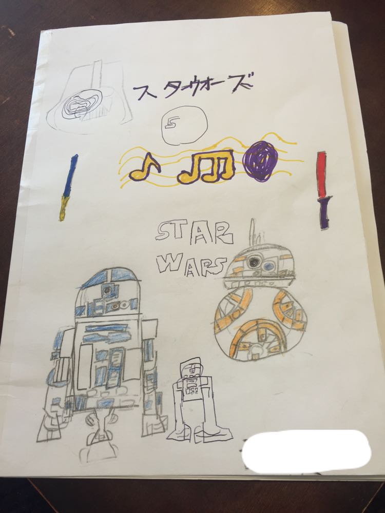 「スターウォーズ」と「ハリーポッター」の曲の楽譜をダウンロードしてプリントしたのを画用紙に貼って、自分で表紙を作ってきました!