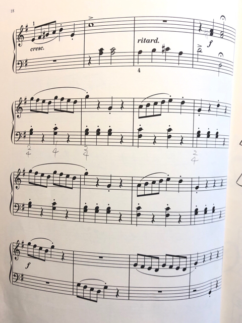 ト長調なのでファの♯の音も両手にたくさん出てくるし、右手はいきなりの1オクターヴの跳躍も出てくるし、左手もオクターブ下に飛ぶし、和音も細かく変わるし途中部分転調するのでほかの音にも急に♯も付くし、右手はスラーが付いててつなげて弾きながら左手はスタッカートだし、「む、難しいかな!?」と内心私は心配してしまったのですが、その方は音もリズムも指使いも間違えずにサラサラ~っと最後まで弾かれました!