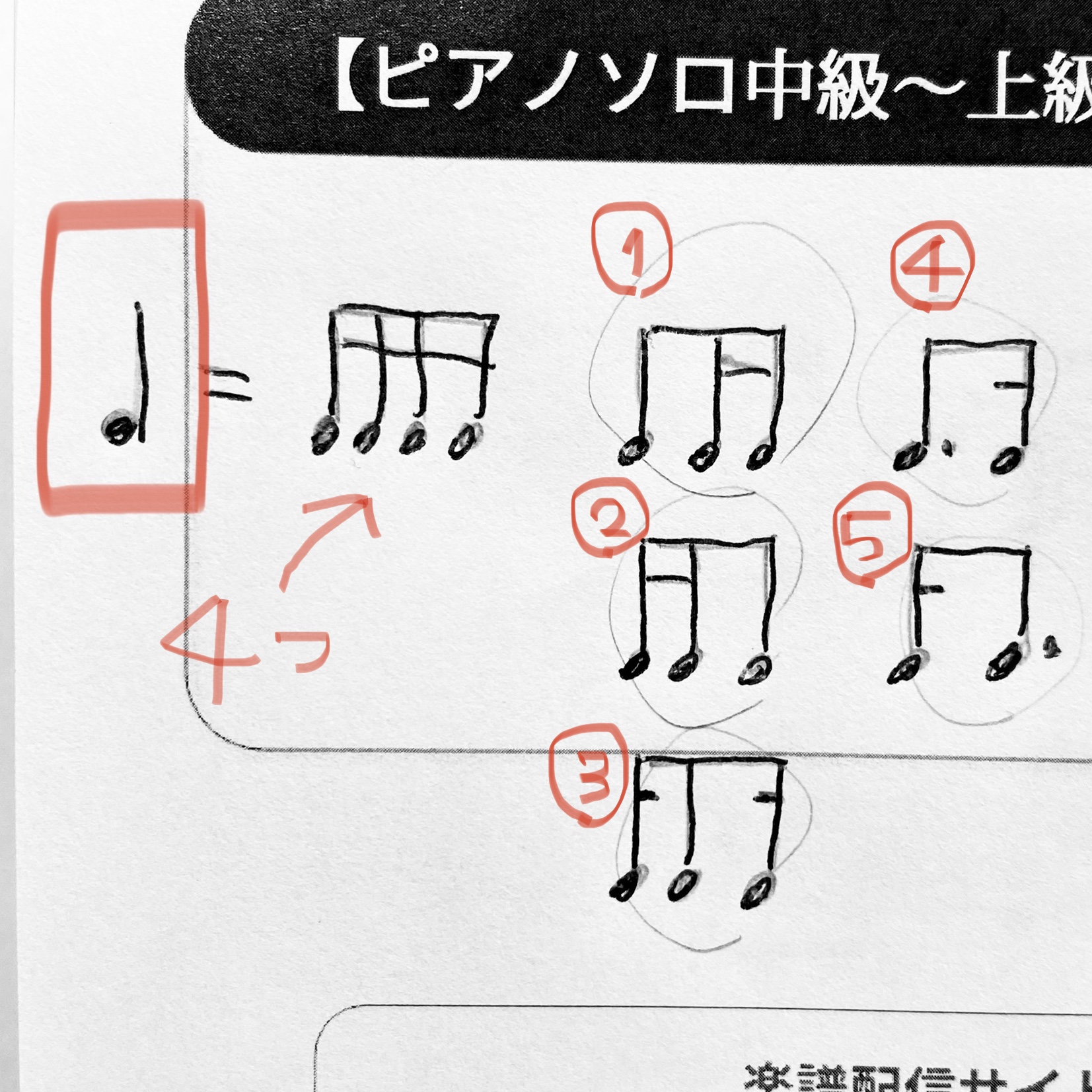(上の写真で赤いカッコでくくってあるのが4分音符(1拍)分)